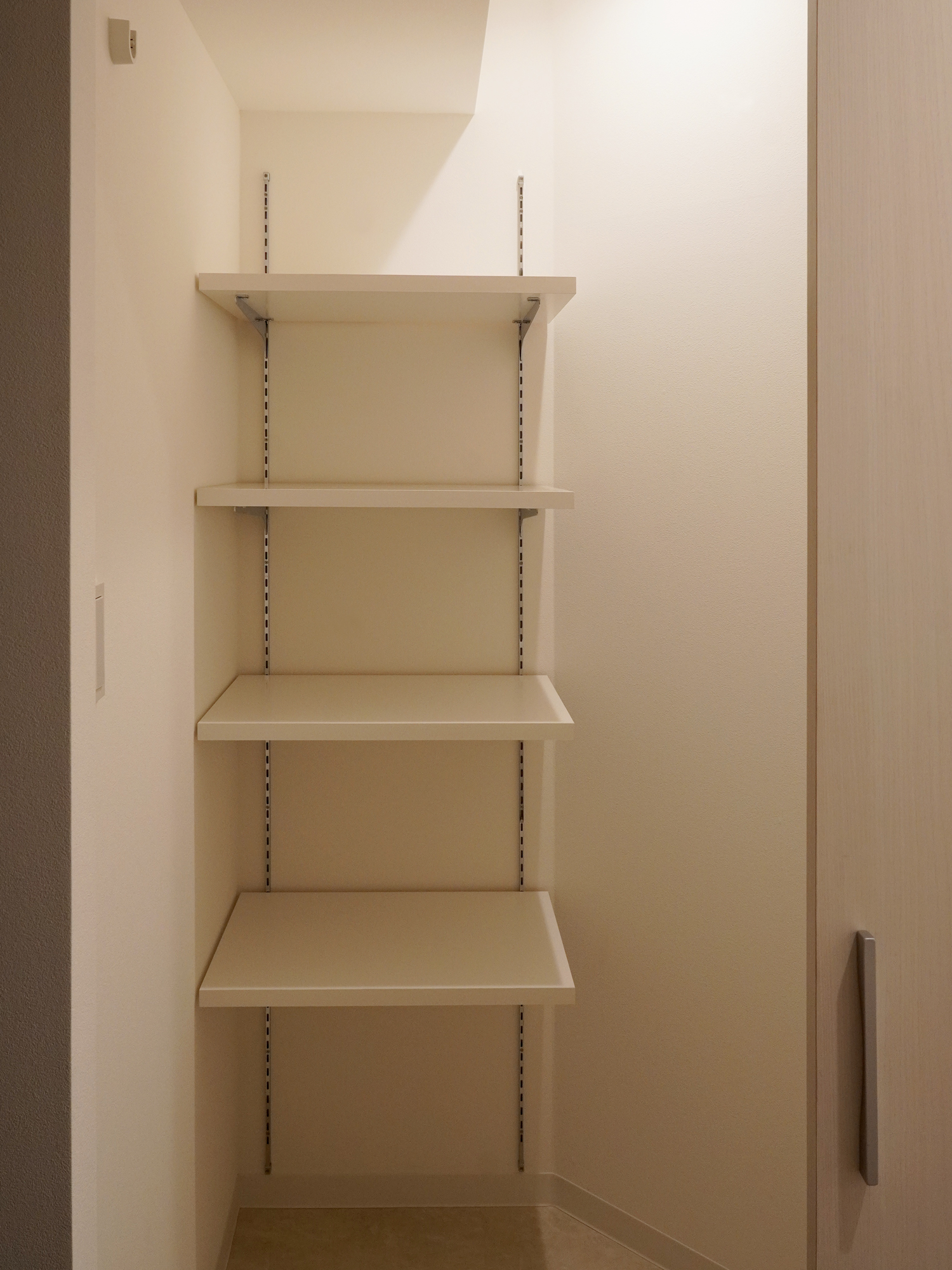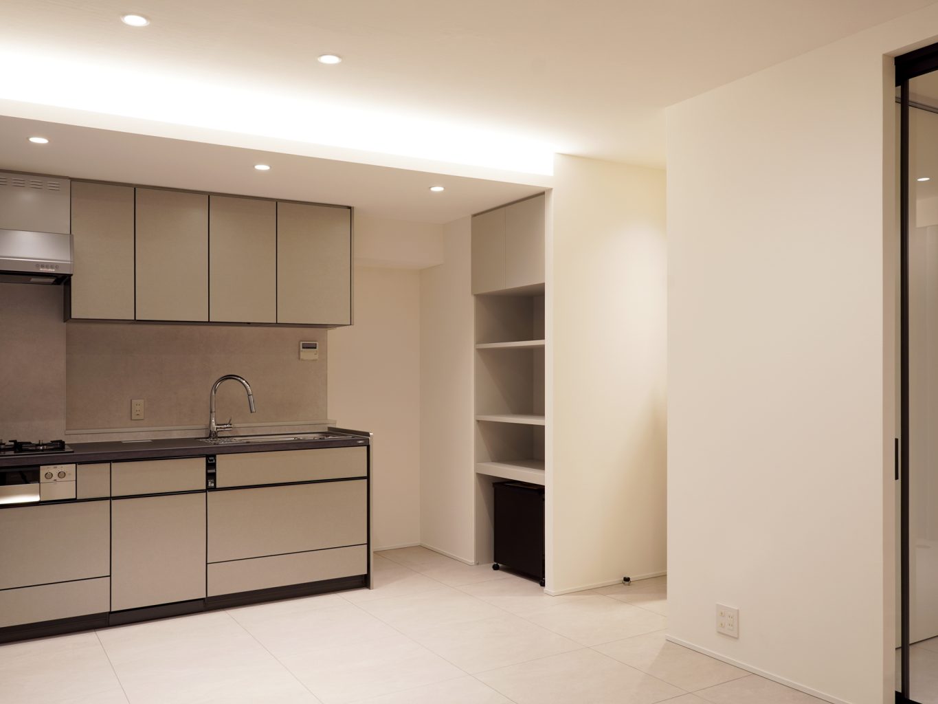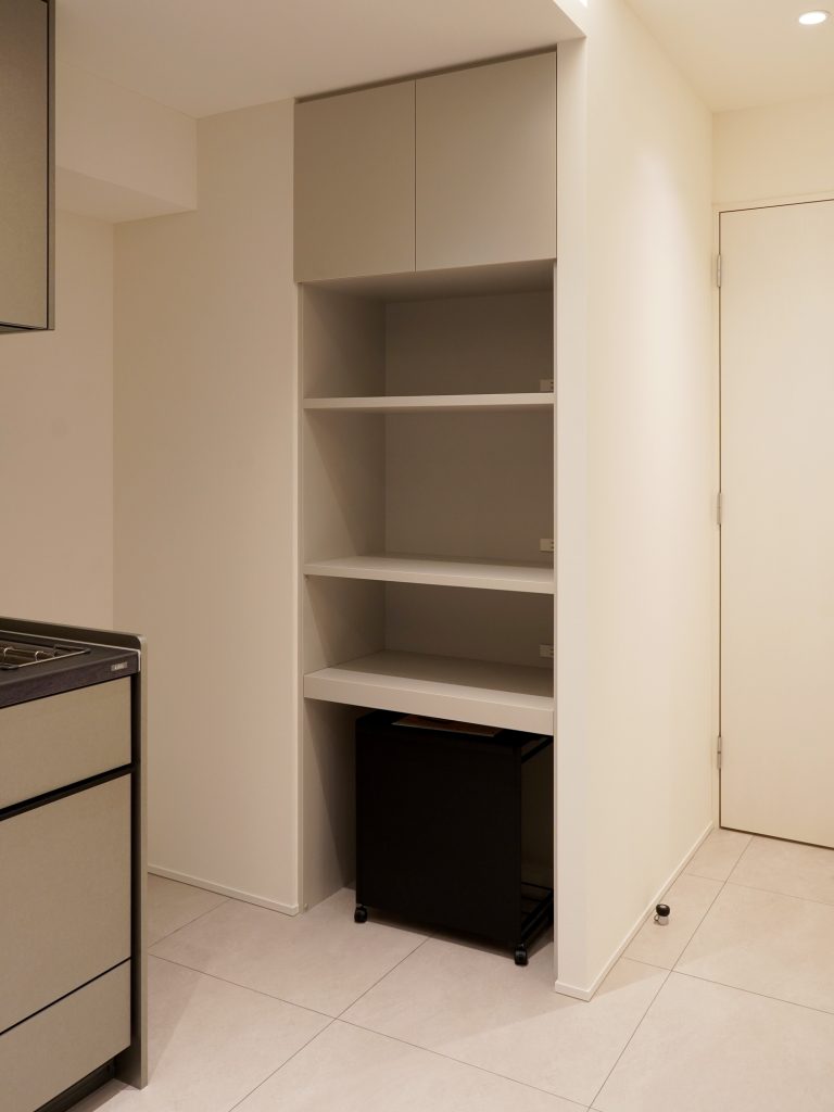 毎日を快適に過ごすためには、収納力も欠かせません。本来は壁だった箇所に、キッチン横のレンジ収納や玄関横のシューズクロークを設け、スペースを有効活用した大容量収納を実現しました。
