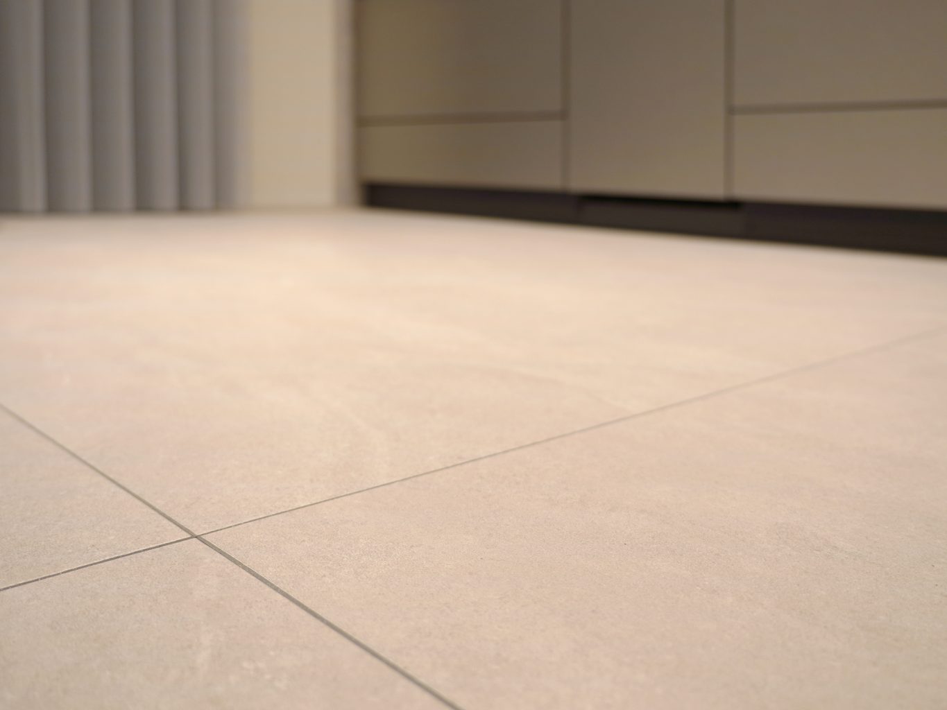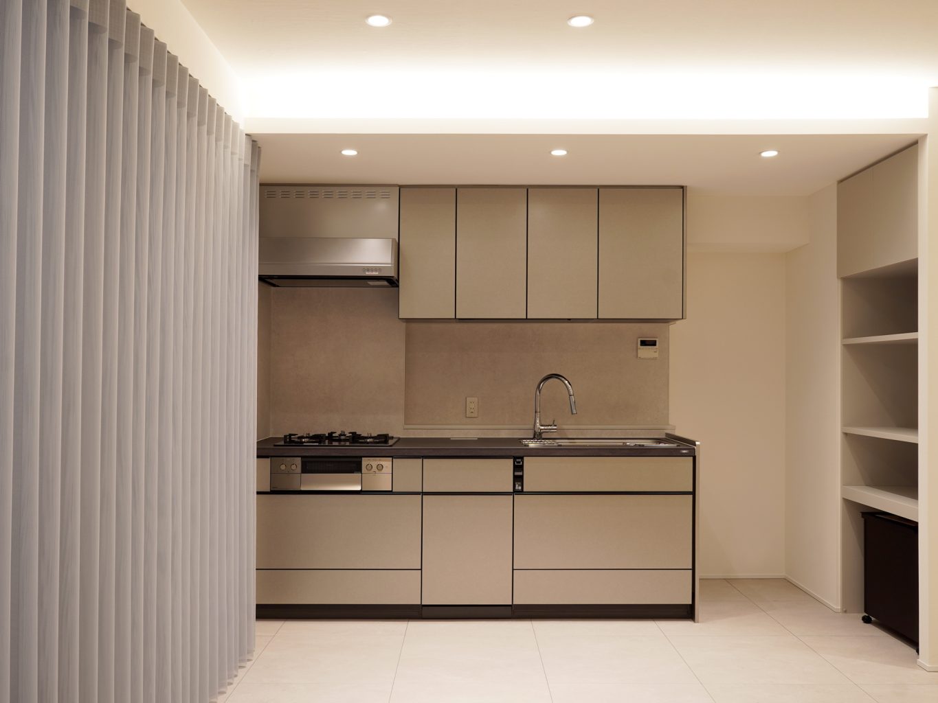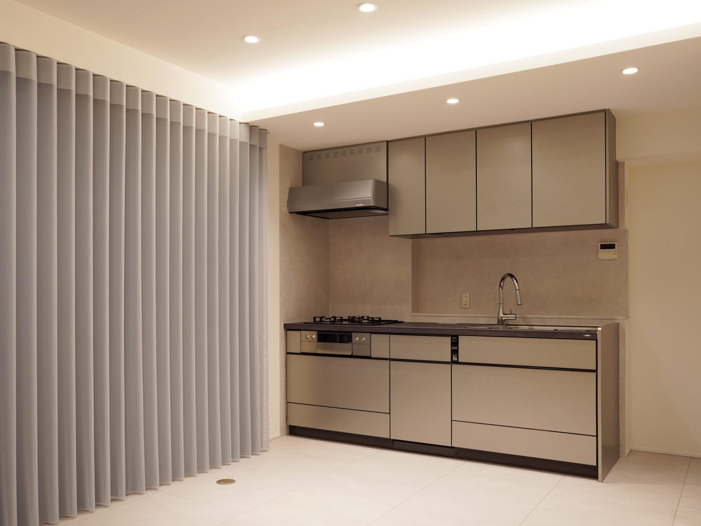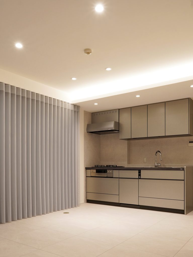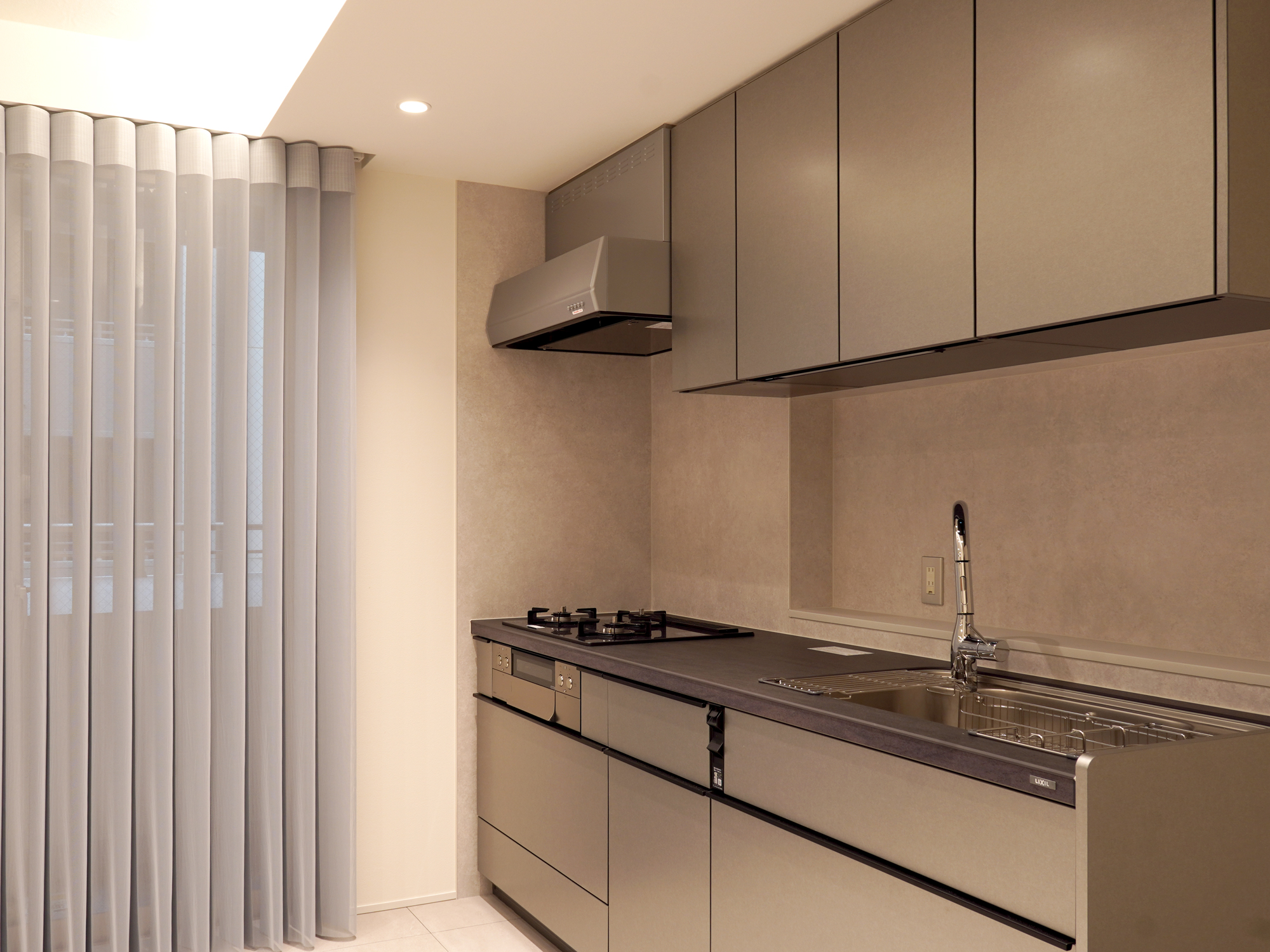 グレーを基調としたセラミック天板のキッチンをはじめ、壁材や床材、シェードなどをモノトーンで統一することで、都会的な雰囲気を感じるインテリアに。