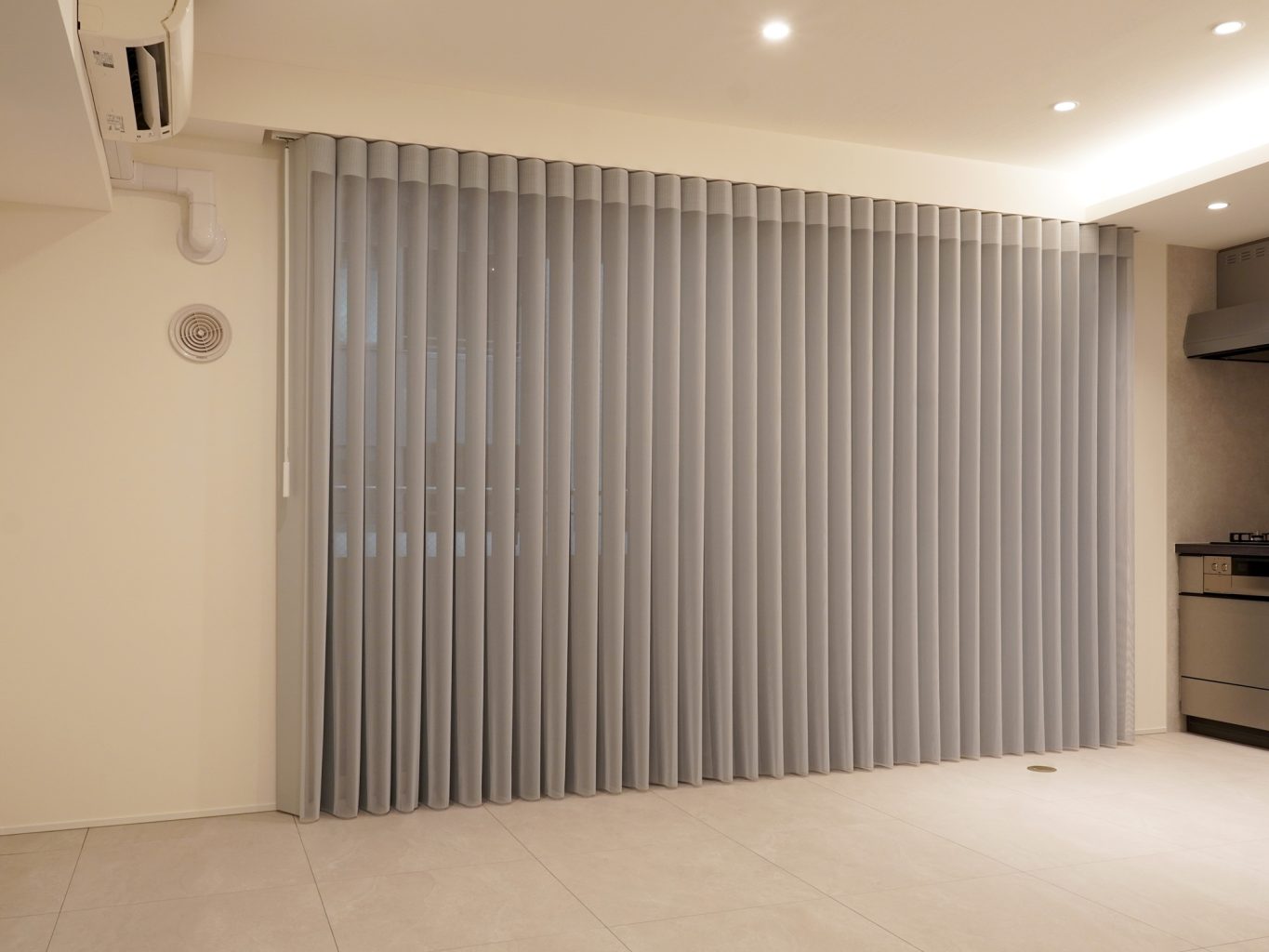 また、天井のダウンライトや間接照明、縦ラインが際立つシェードのおかげで天井が高く見えるため、より一層空間の広がりを感じることができます。