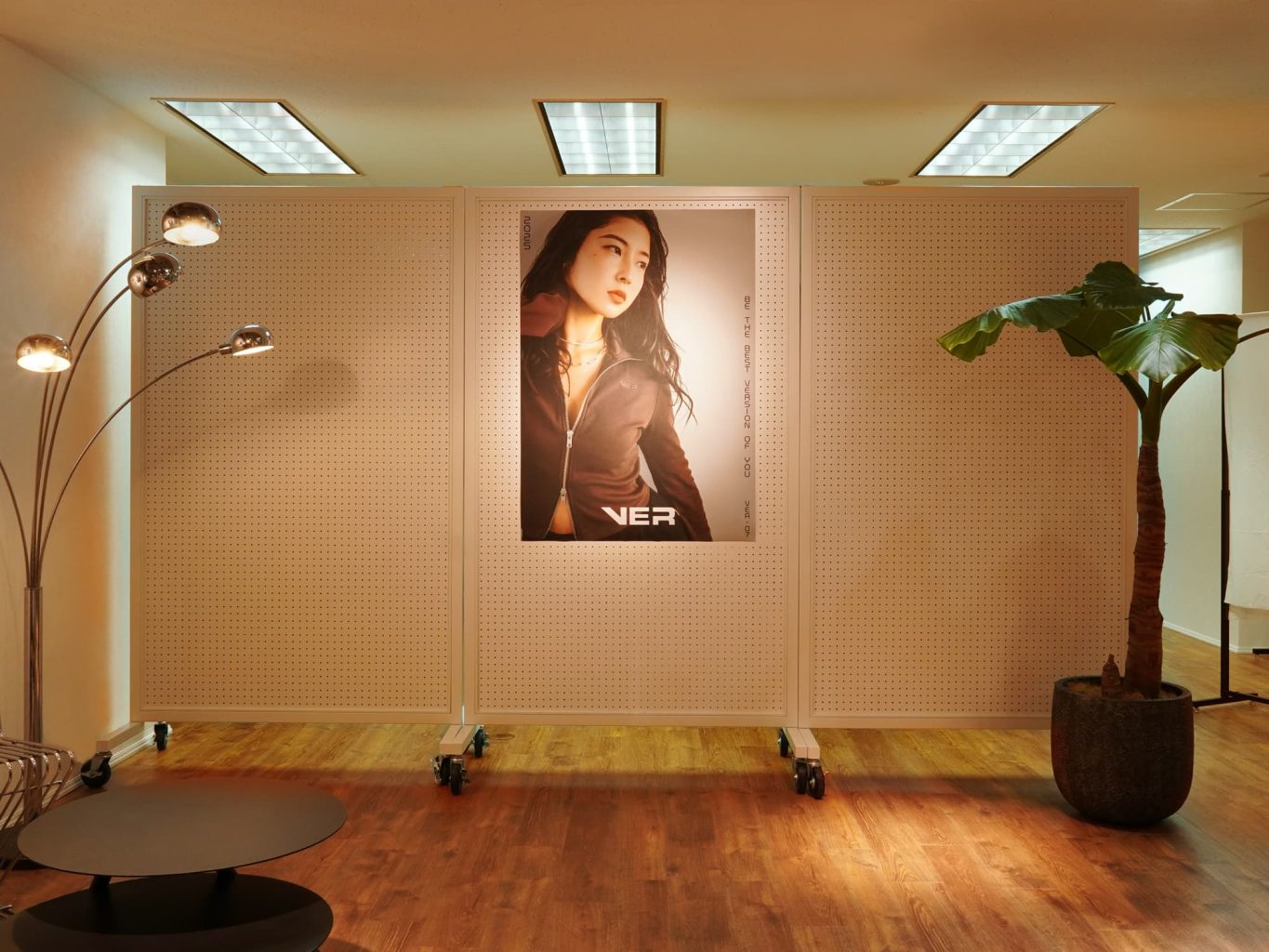 有孔ボードの可動パーティションは自社デザインで製作しました。