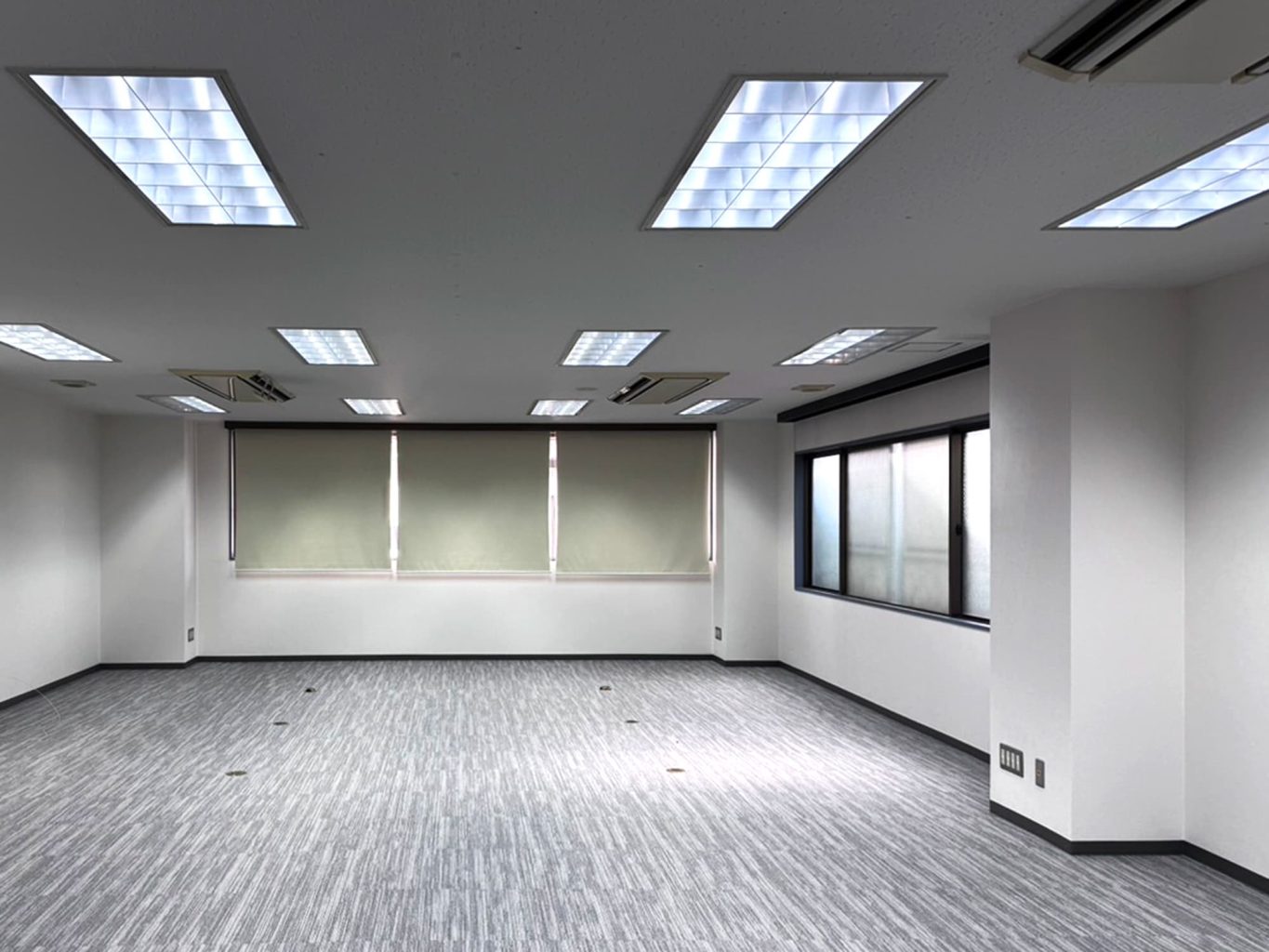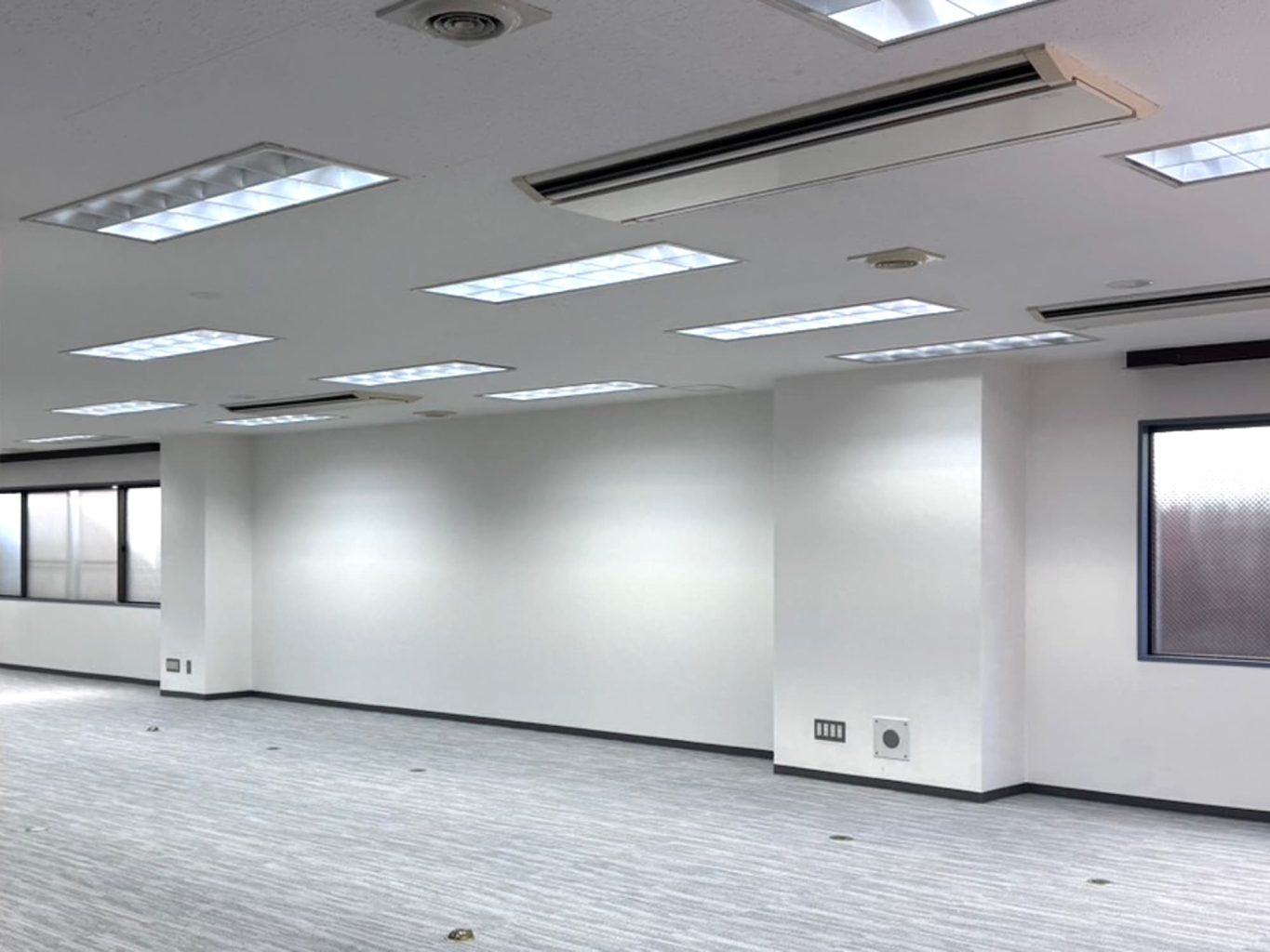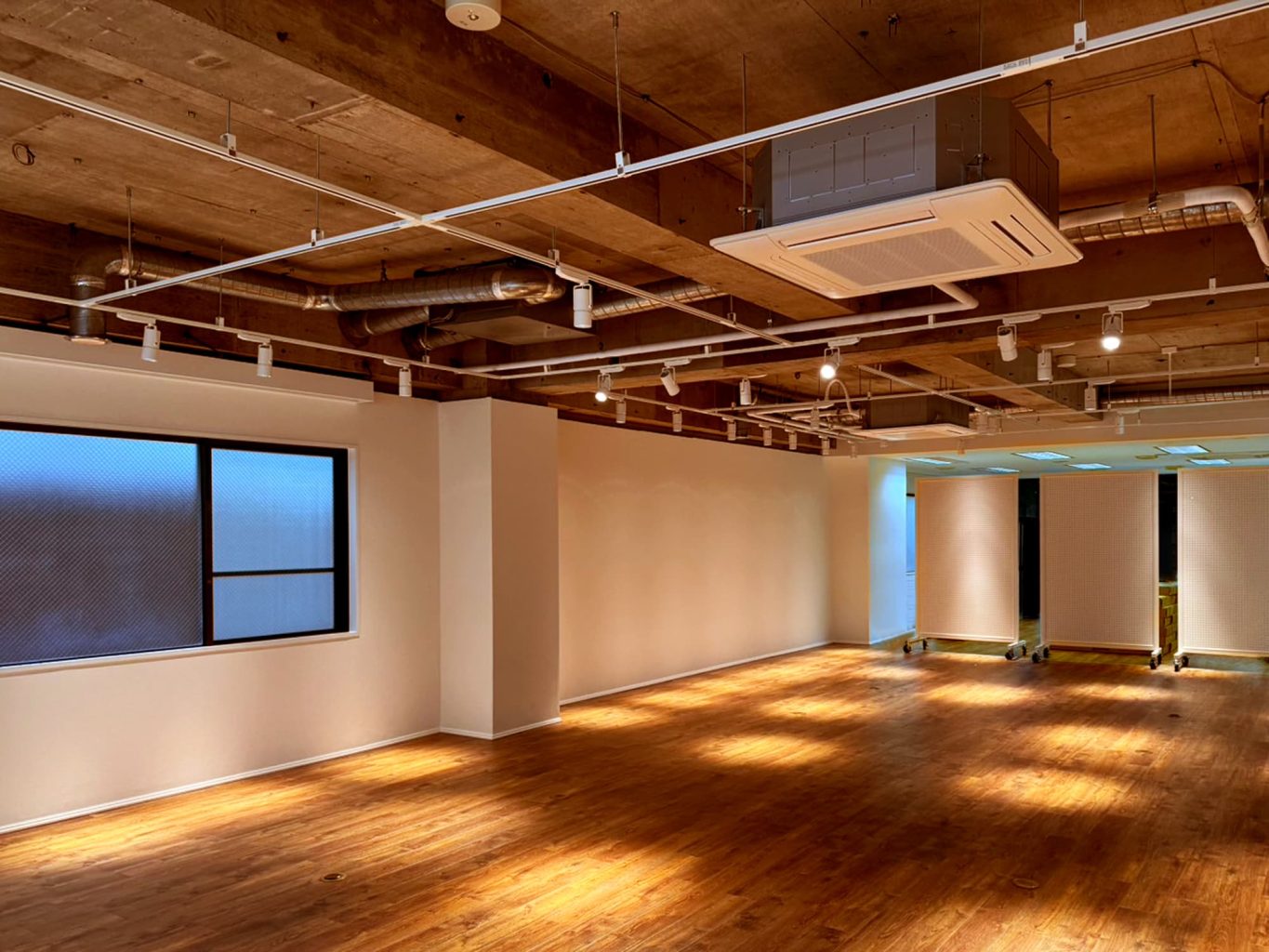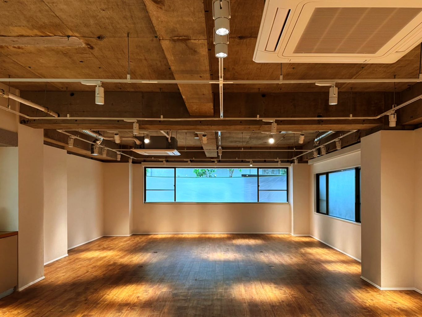 既存がオフィス内装だったため、天井をスケルトン天井に変更、巾木はサンメントを使用し、窓枠は白で塗装するなど、オフィスっぽさを極力なくすように工夫しています。
