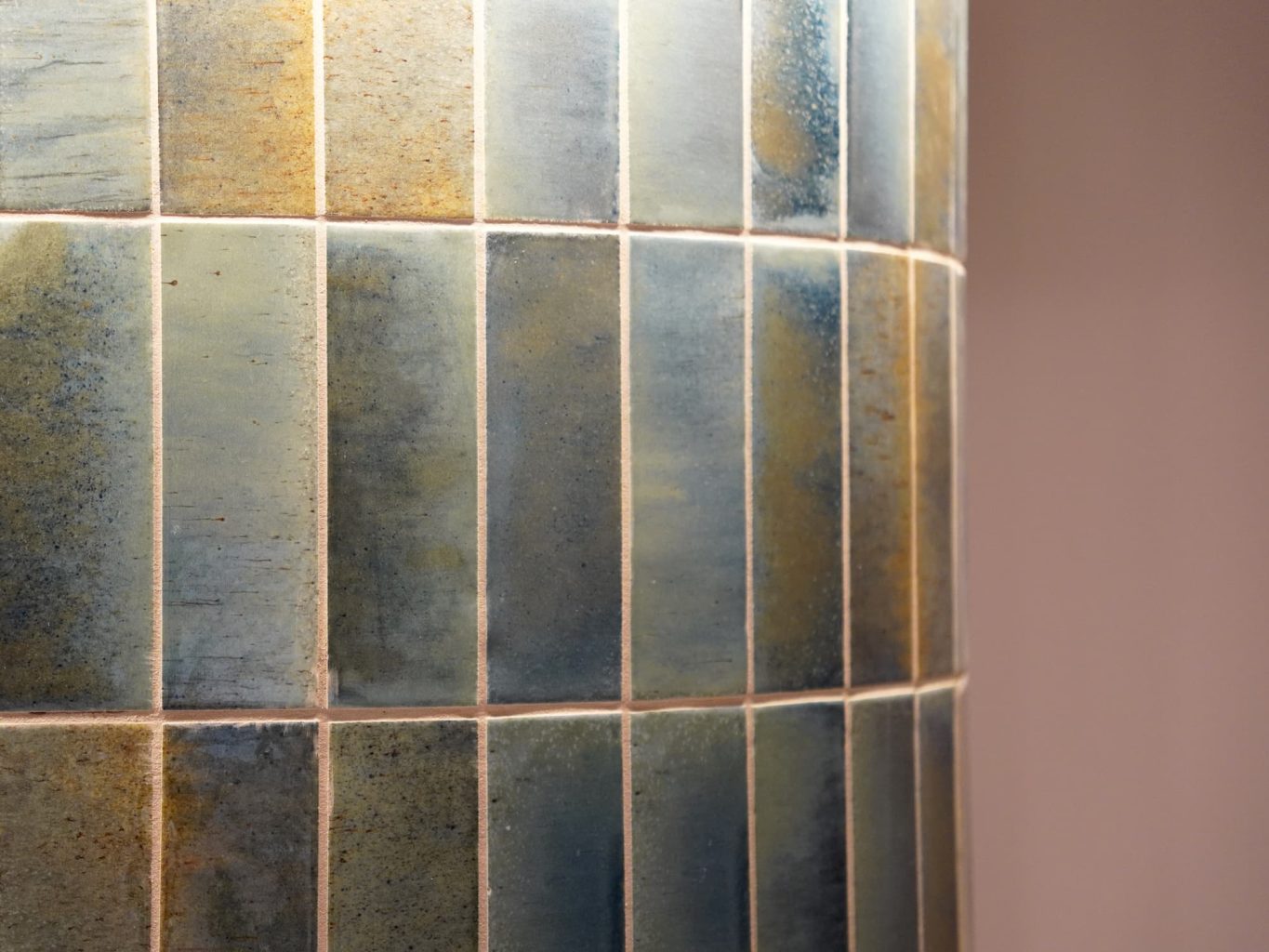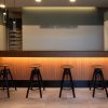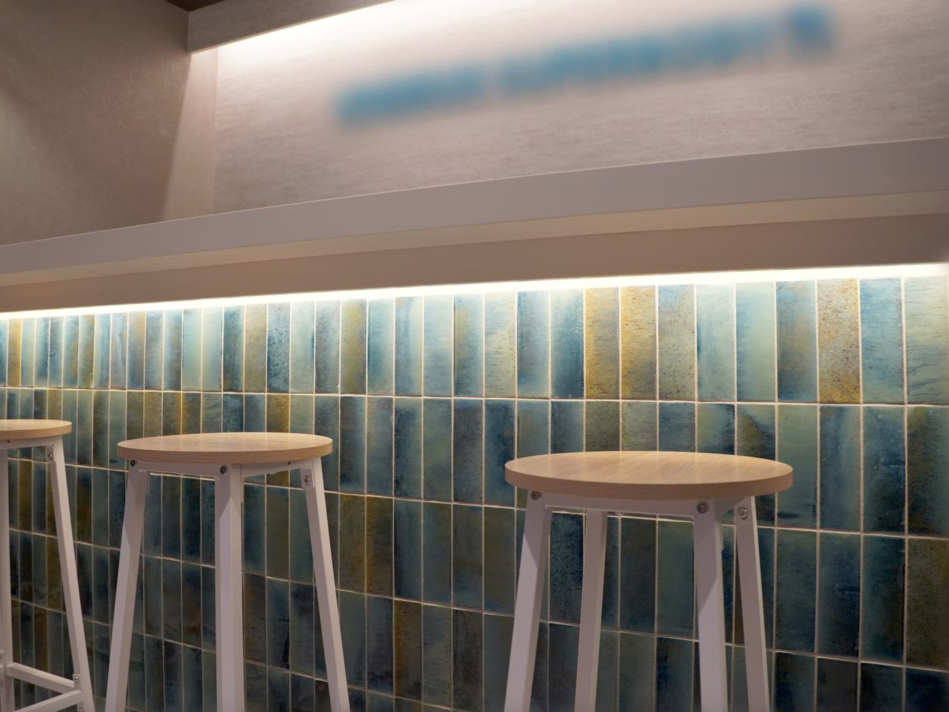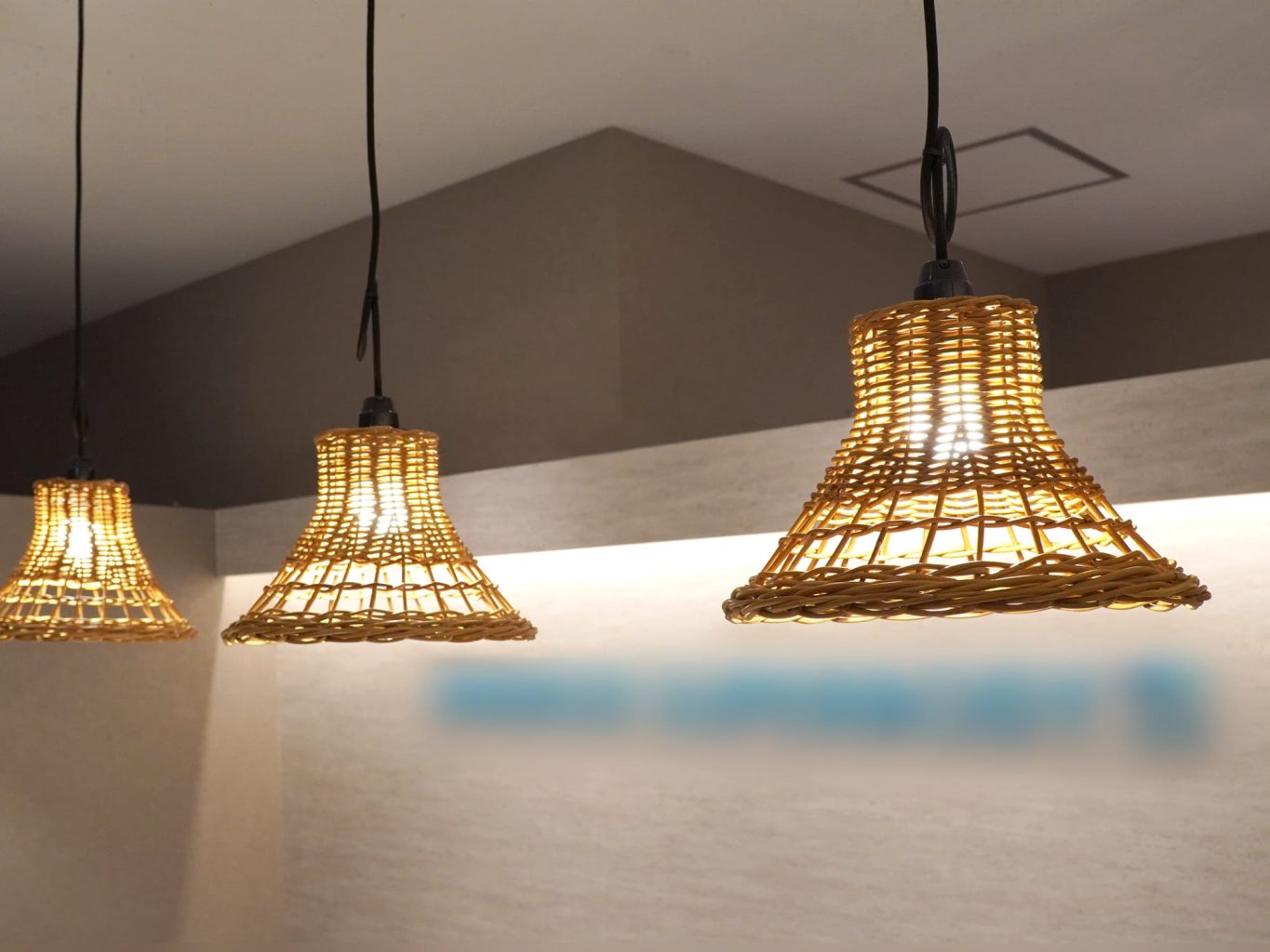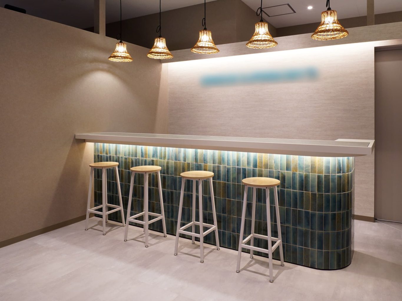 カウンターは、味わいのある緑青色のタイルを使用し、上部の照明にはラタン調のペンダントランプを配することで、海沿いのホテルのレセプションを思わせるデザインに。